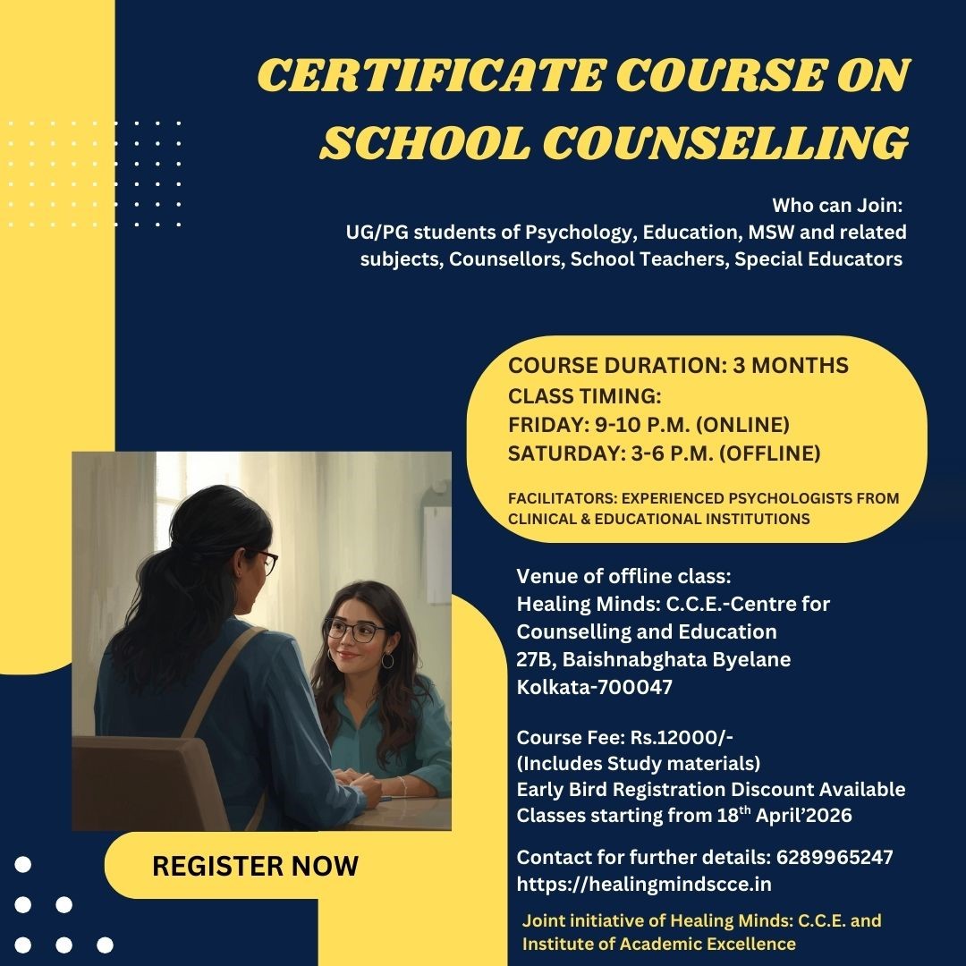 Recognizing this vital need, the Centre for Counselling and Education (Healing Minds: C.C.E.) and the Institute of Academic Excellence have joined forces to launch a comprehensive Certificate Course on School Counselling.
